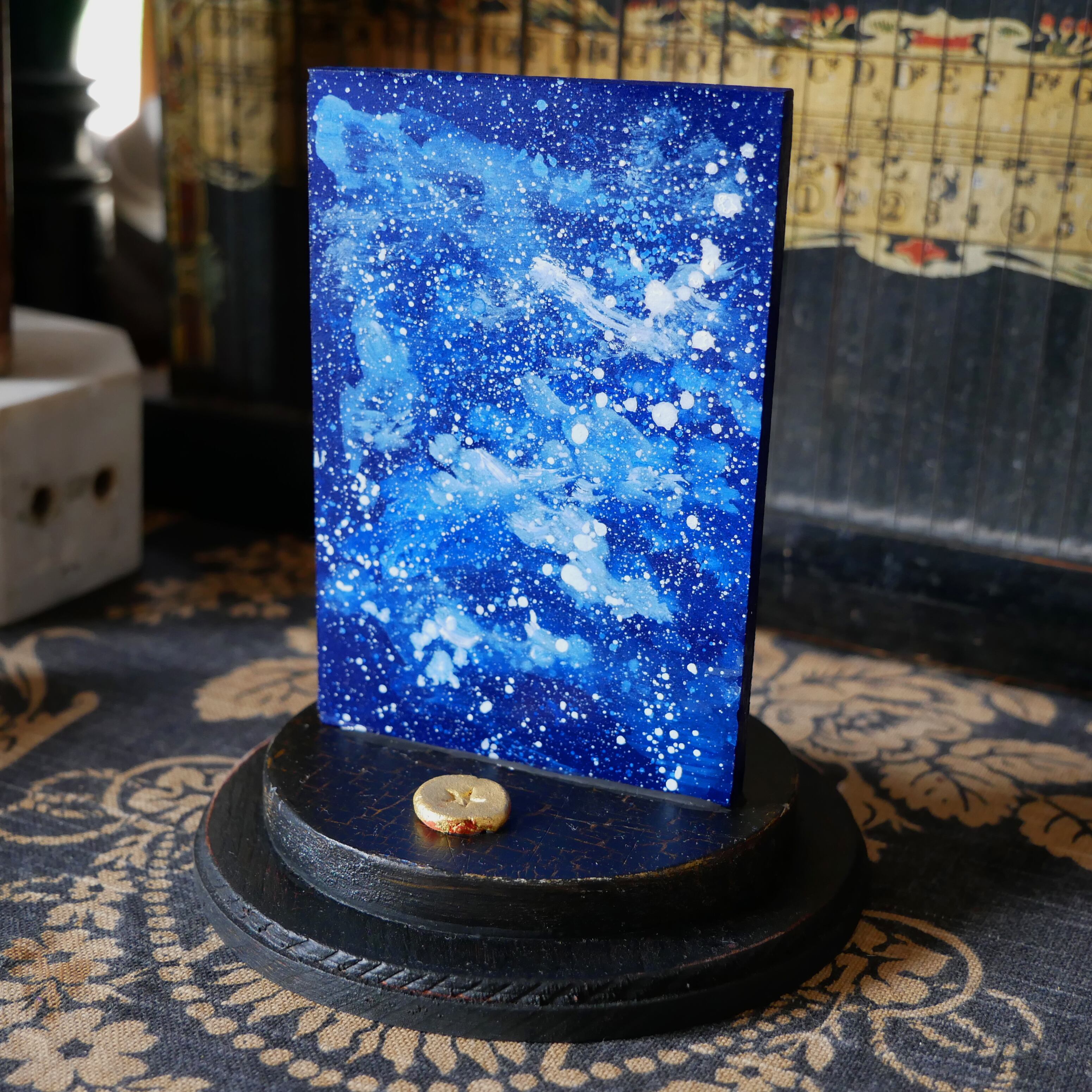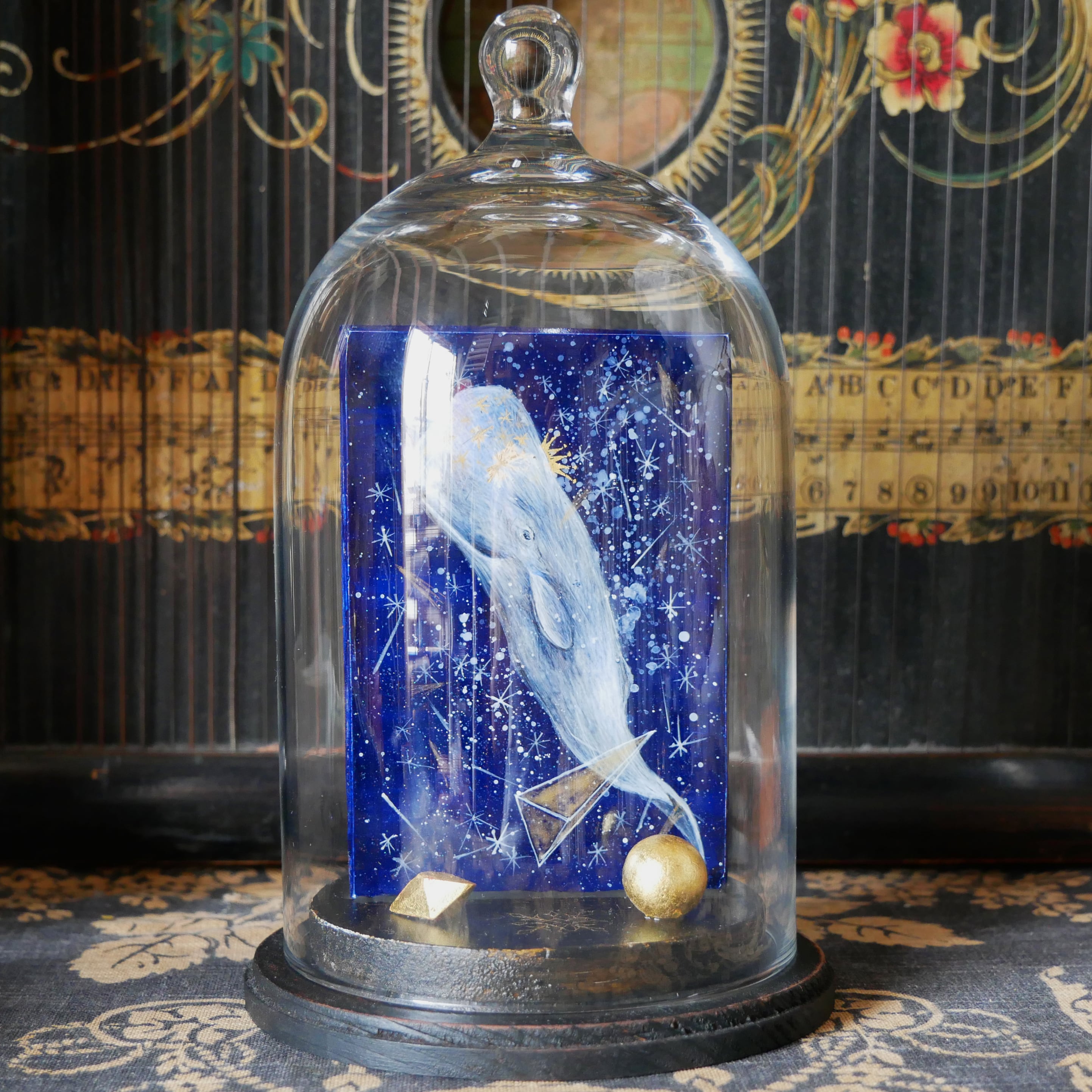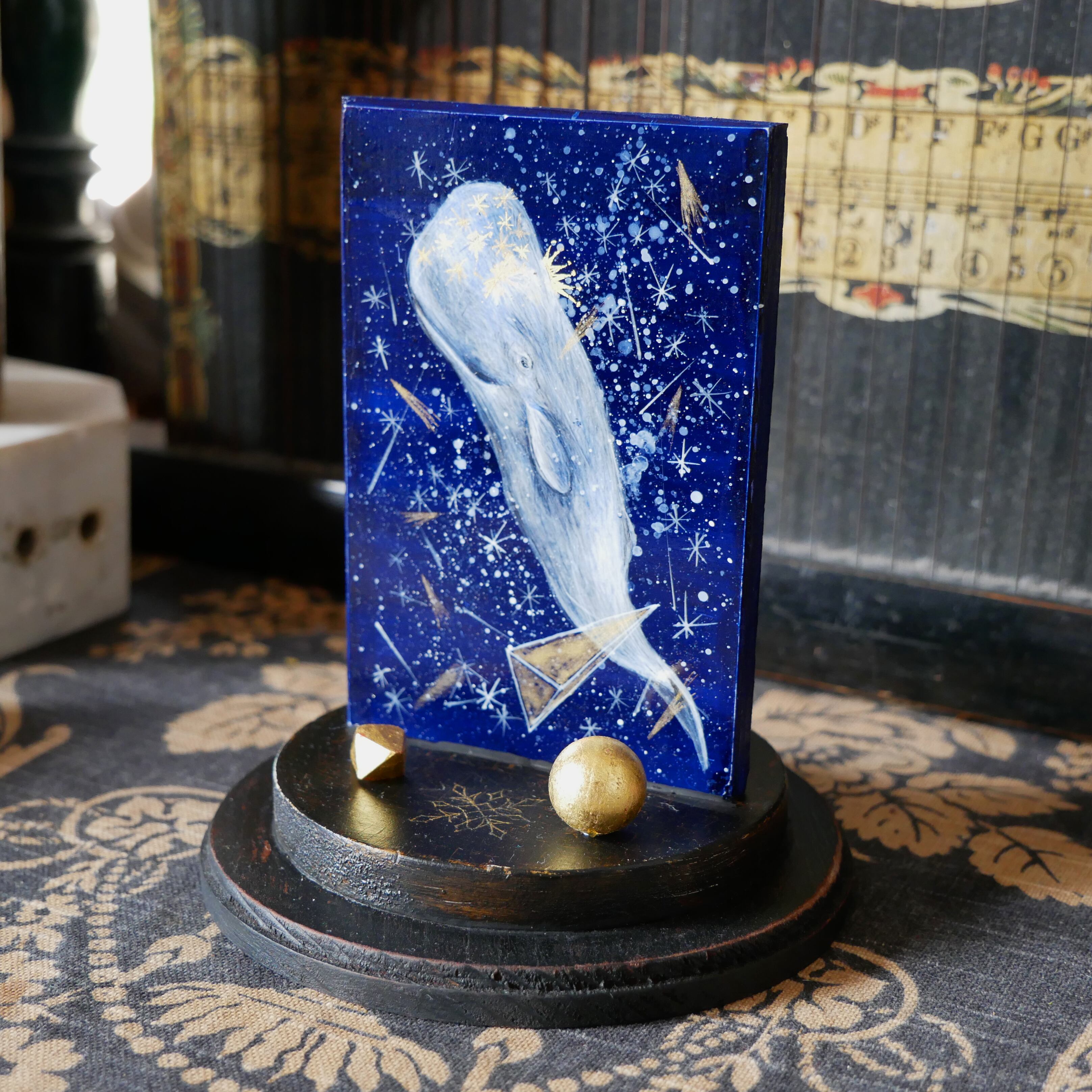夜空を泳ぐクジラを描いてみました。所々金箔で模様を描き煌きを表現しています。