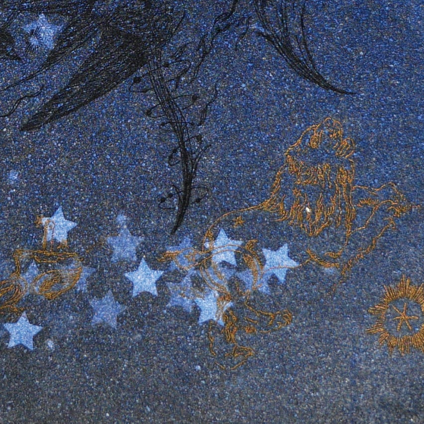 黒い版と金の版の二版を使い一枚の紙に刷り上げています。銅版画特有のインクの深みや色の重なりを感じていただけると嬉しいです。