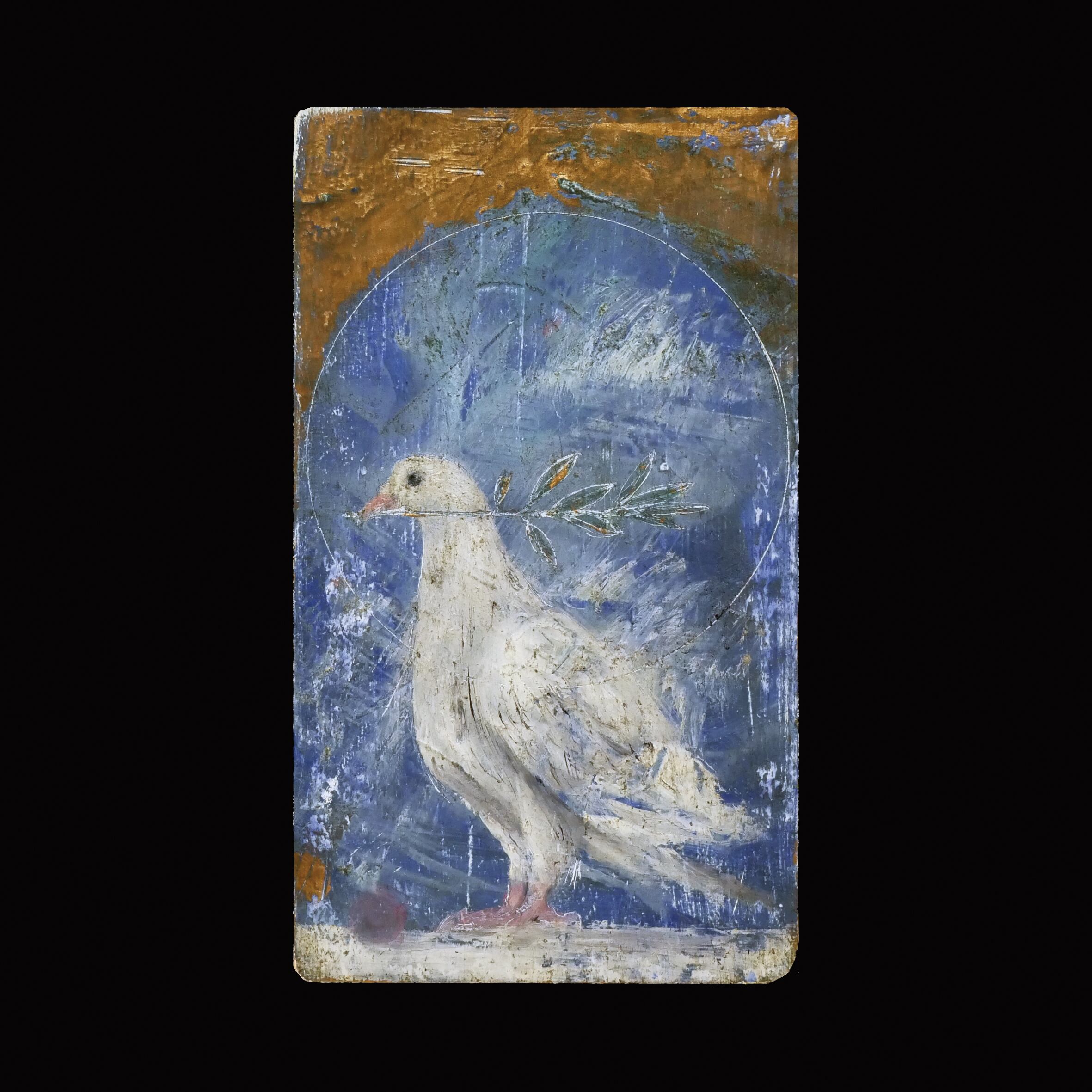 オリーブの枝を銜える一羽の鳩を描きました。