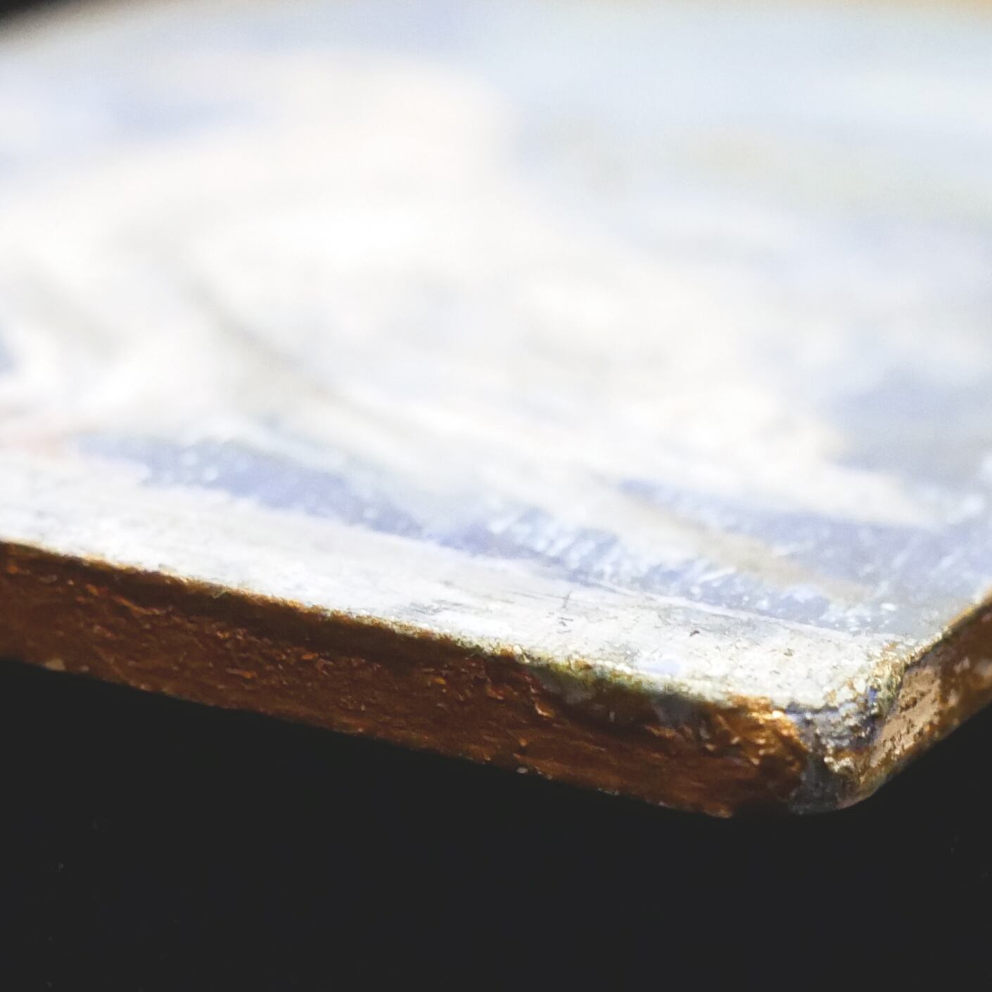 木の板にジェッソを塗り、油絵具で描画しております。所々金色の部分は額縁の補修用絵具を使用しております。