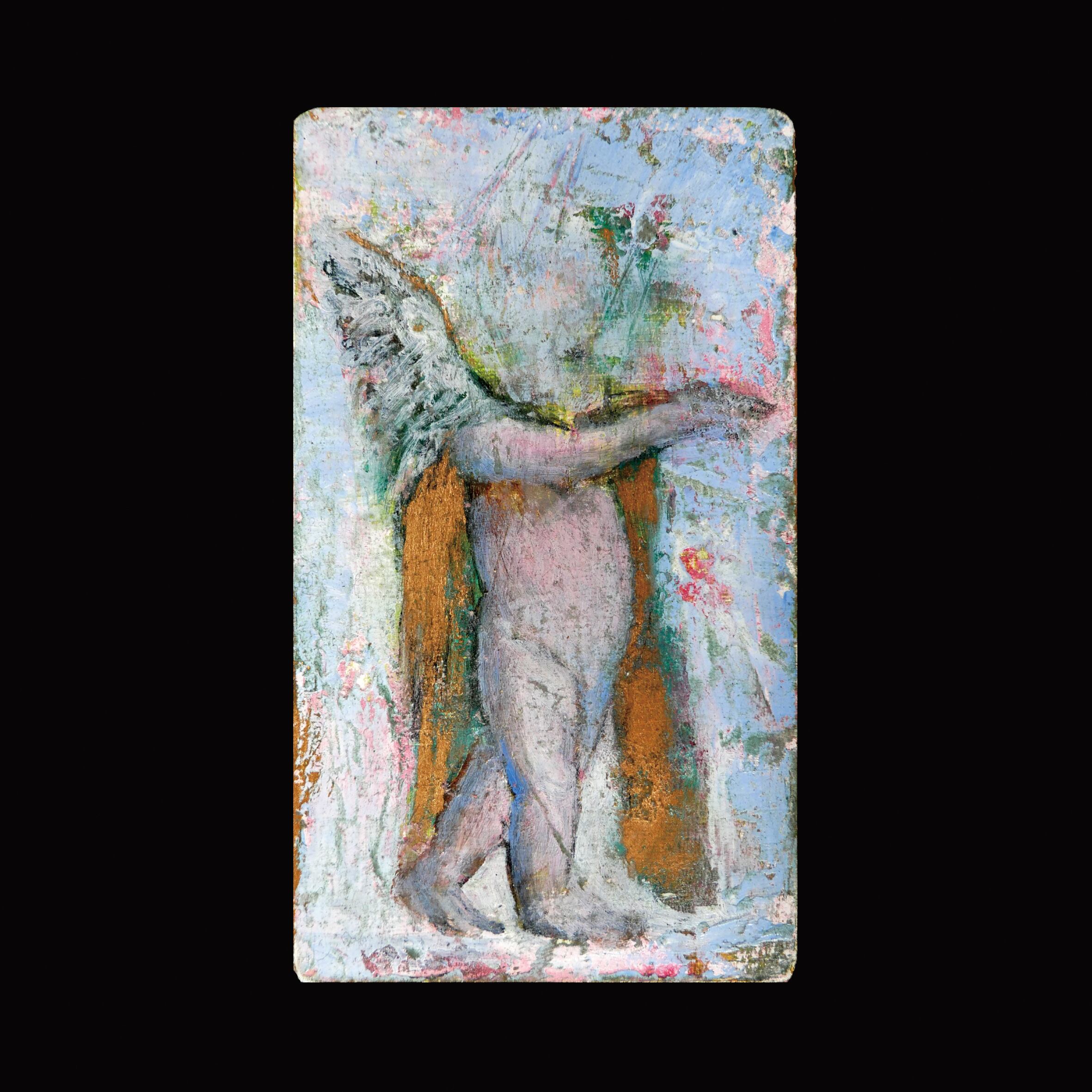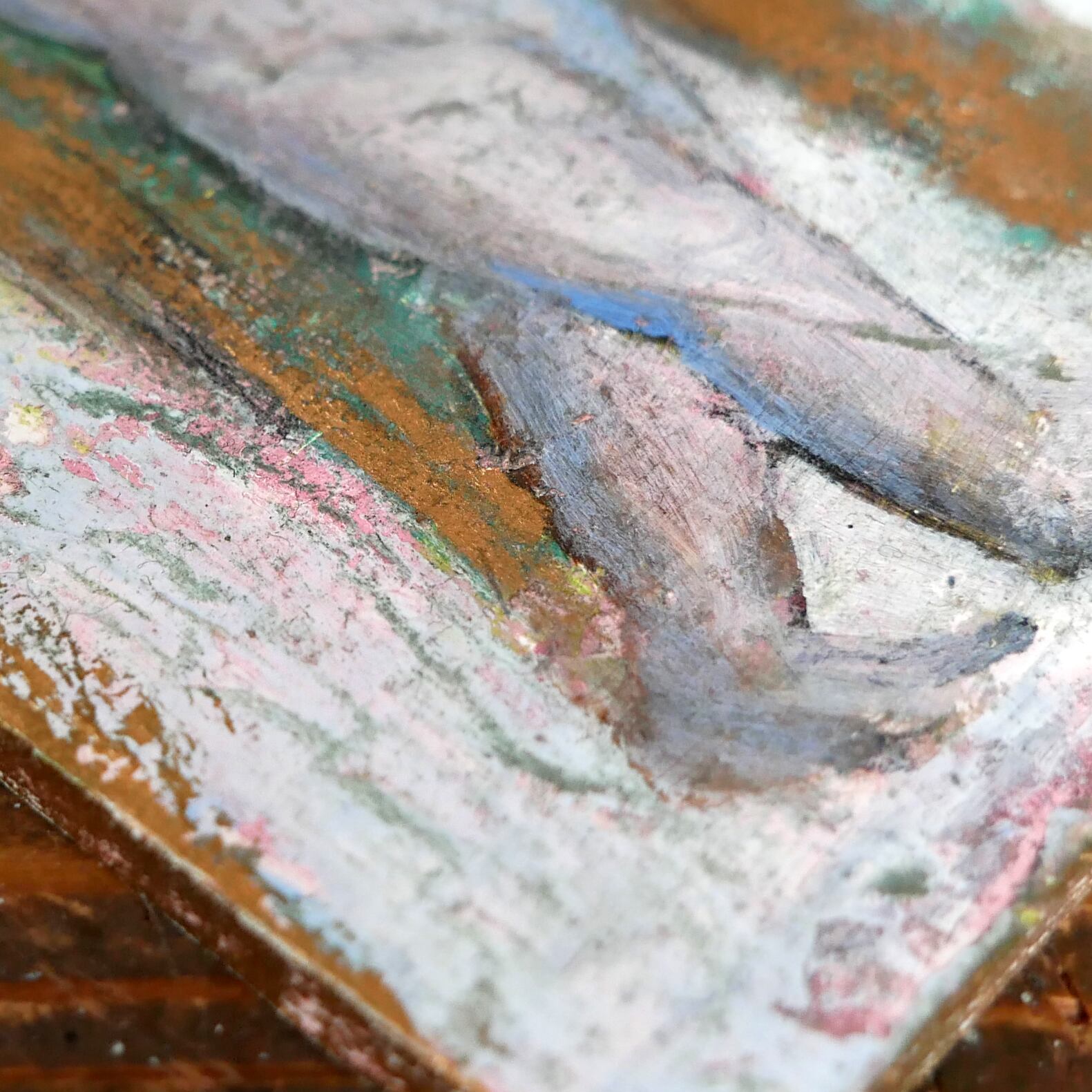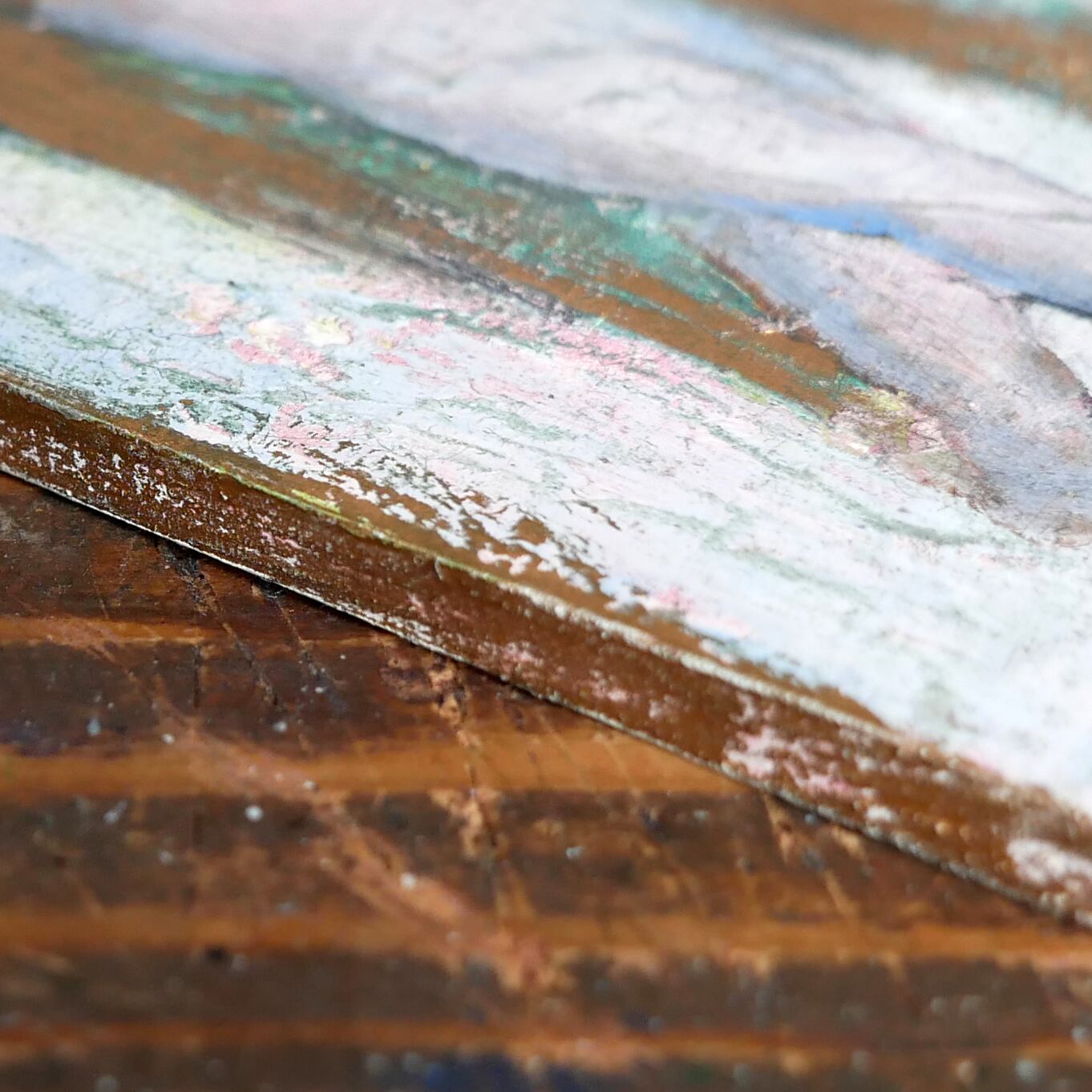 絵を描き上げてからヤスリで削って下層の絵具を出したり、ニードルで引っ掻いたりと古い風合いを目指しました。