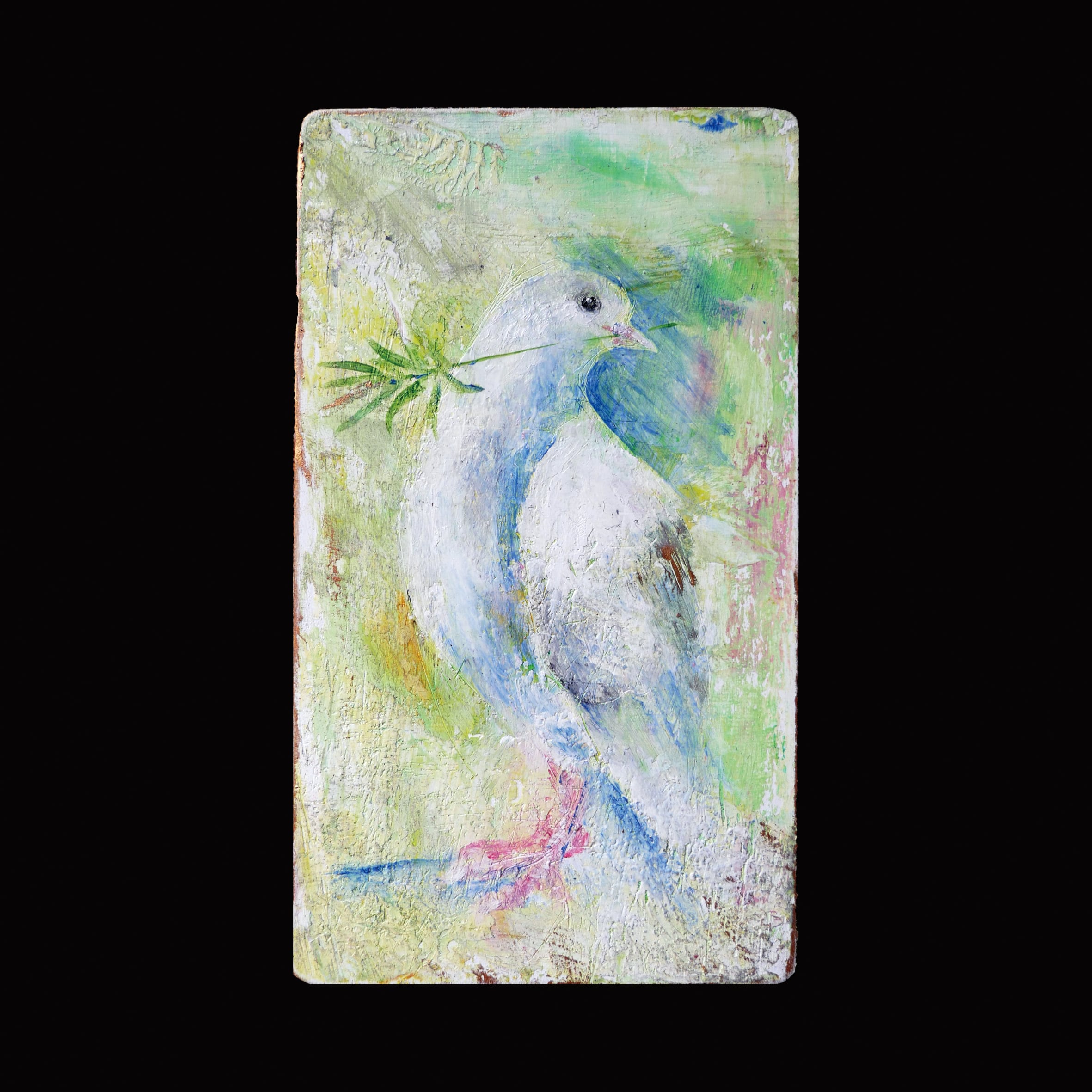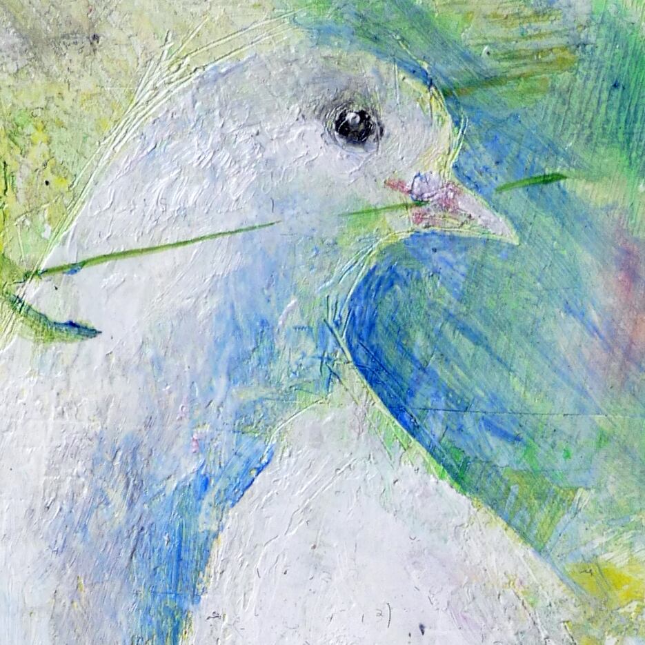 オリーブの枝を銜える一羽の鳩を描きました。
