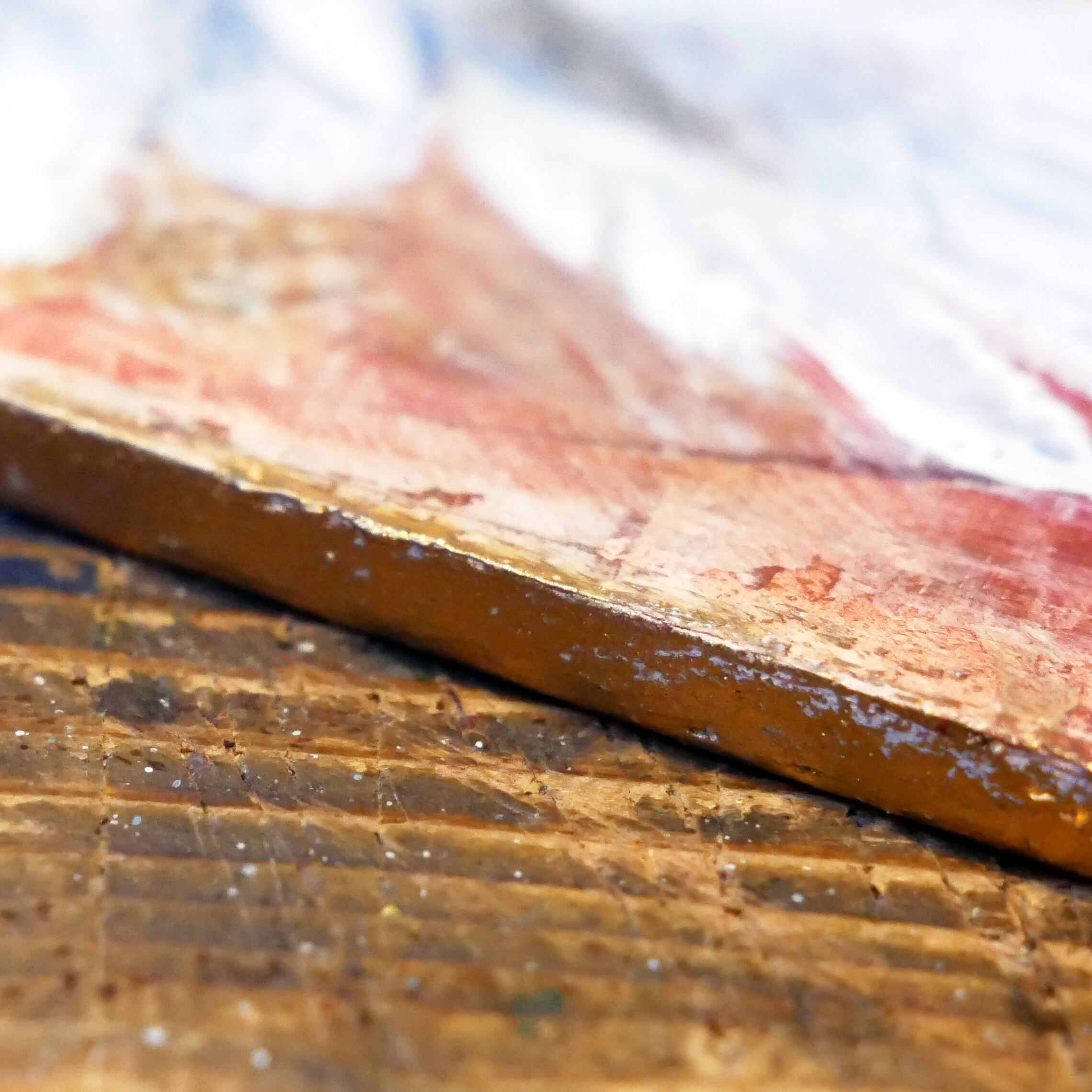 絵を描き上げてからヤスリで削って下層の絵具を出したり、ニードルで引っ掻いたりと古い風合いを目指しました。