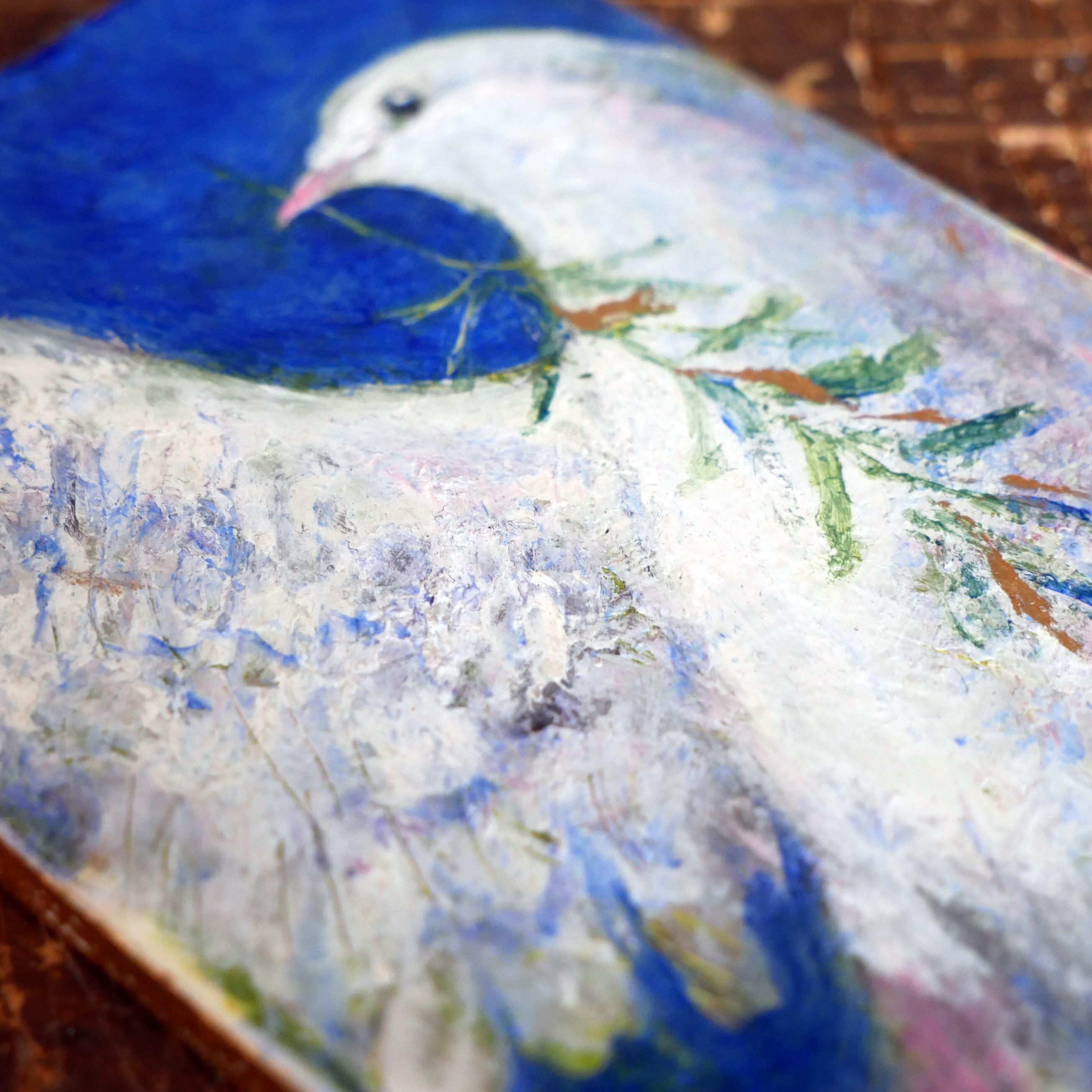絵を描き上げてからヤスリで削って下層の絵具を出したり、ニードルで引っ掻いたりと古い風合いを目指しました。