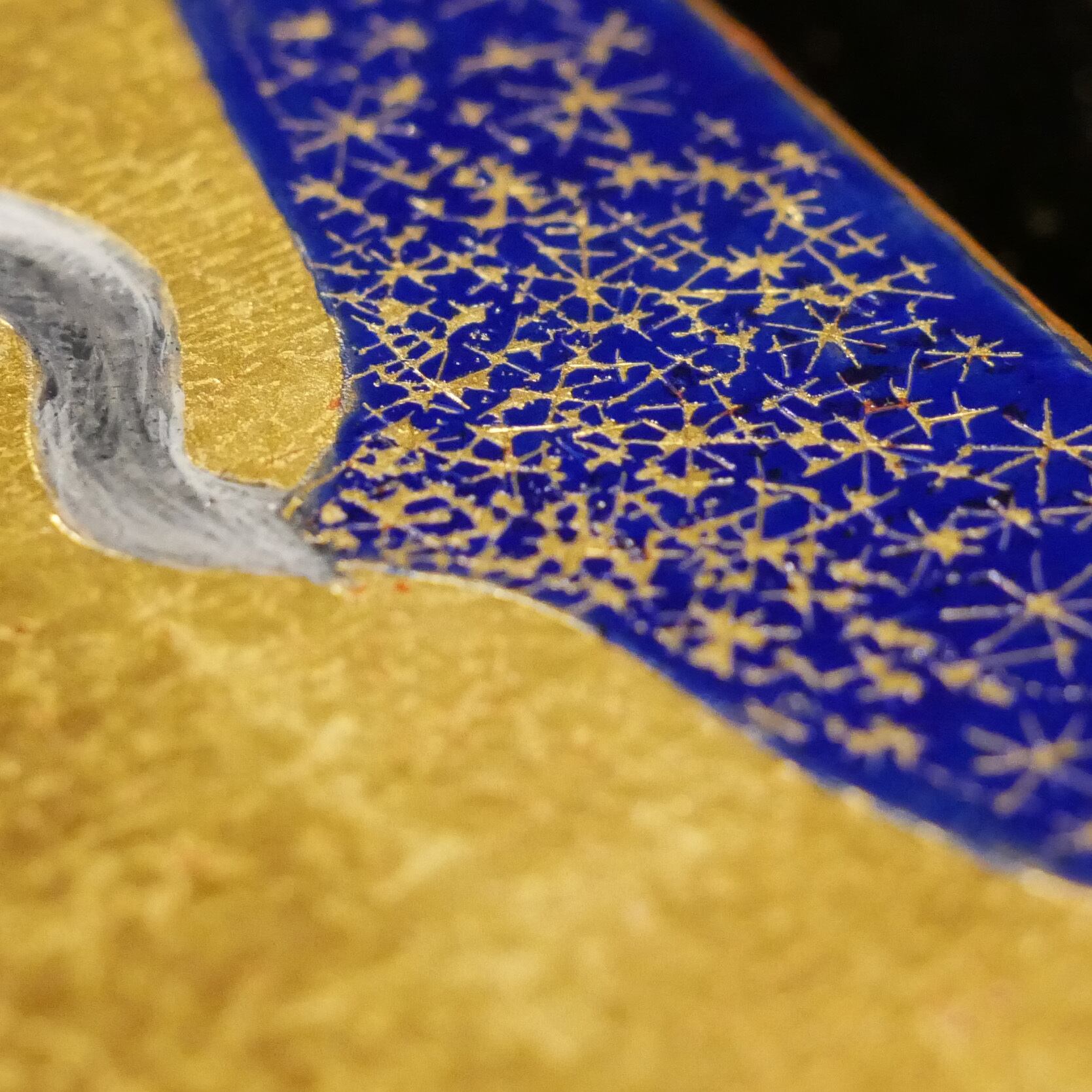 木の板に石膏を塗り平らに削り、その上に特殊な技法で金箔を貼りテンペラ絵具で描画しております。
