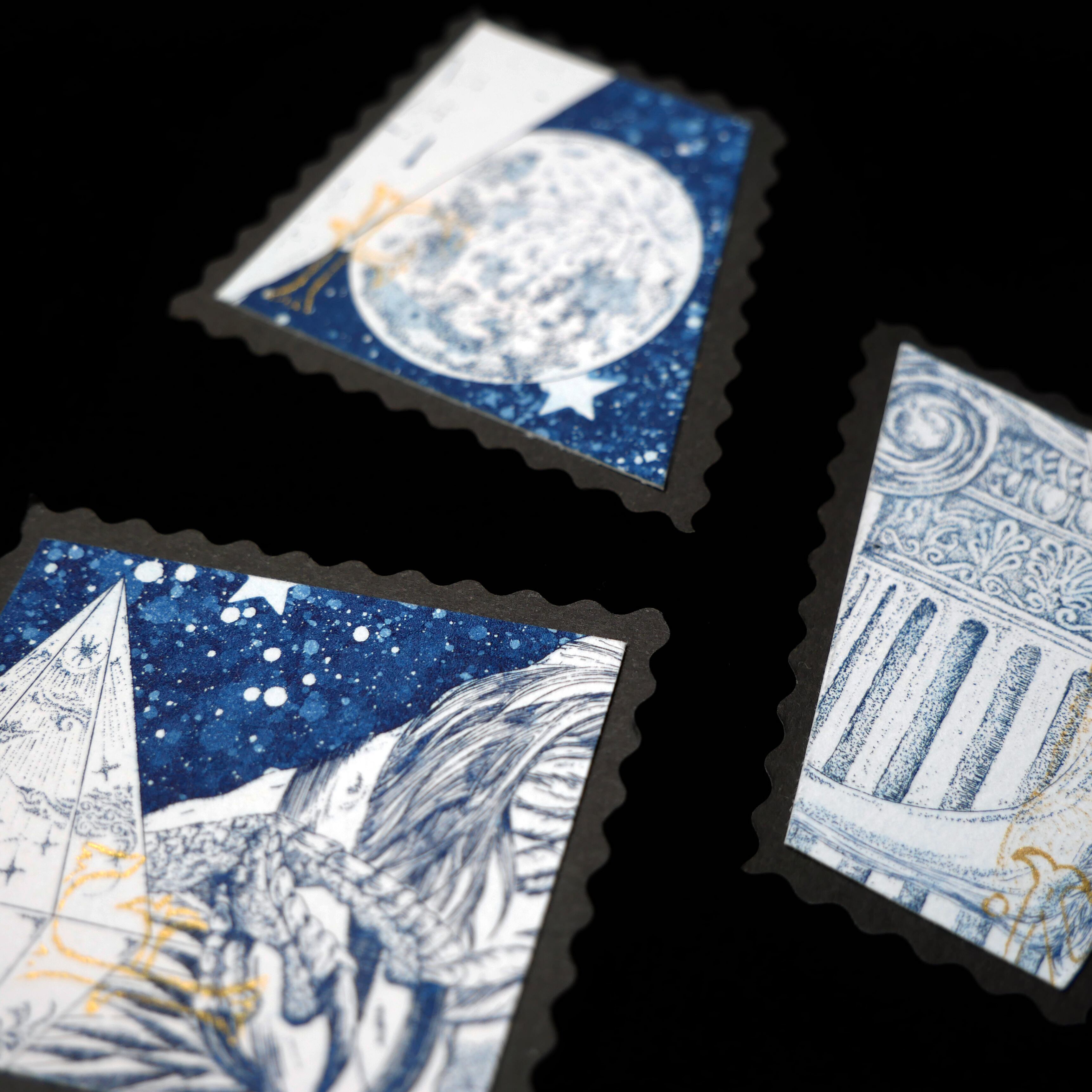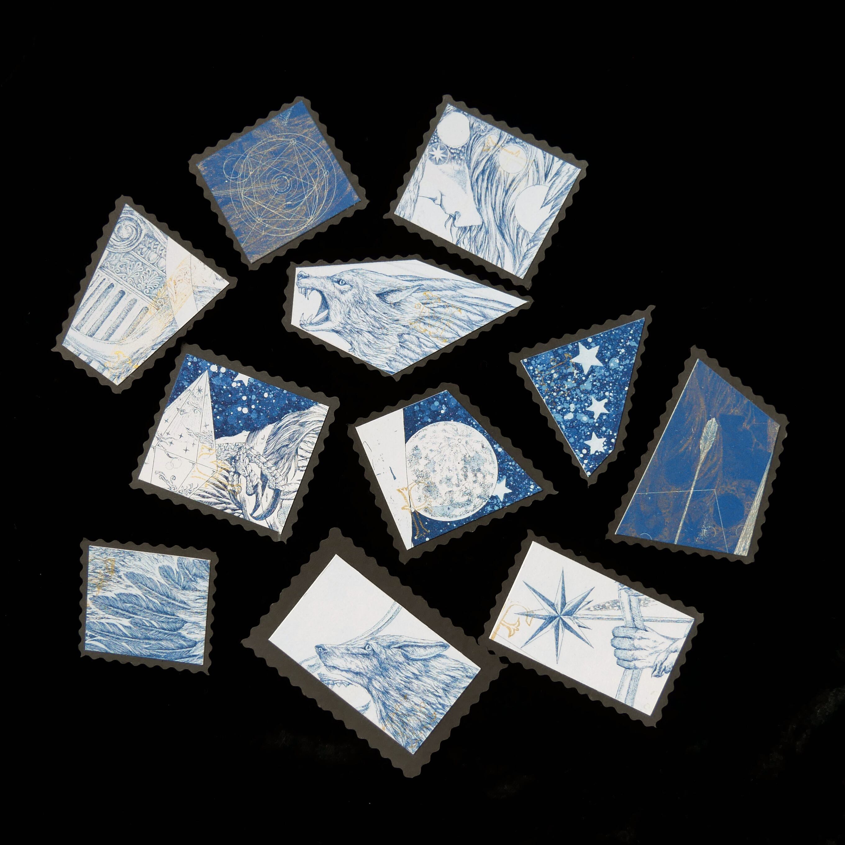 銅版画で制作した作品の部分をカットし、切手風に仕上げました。