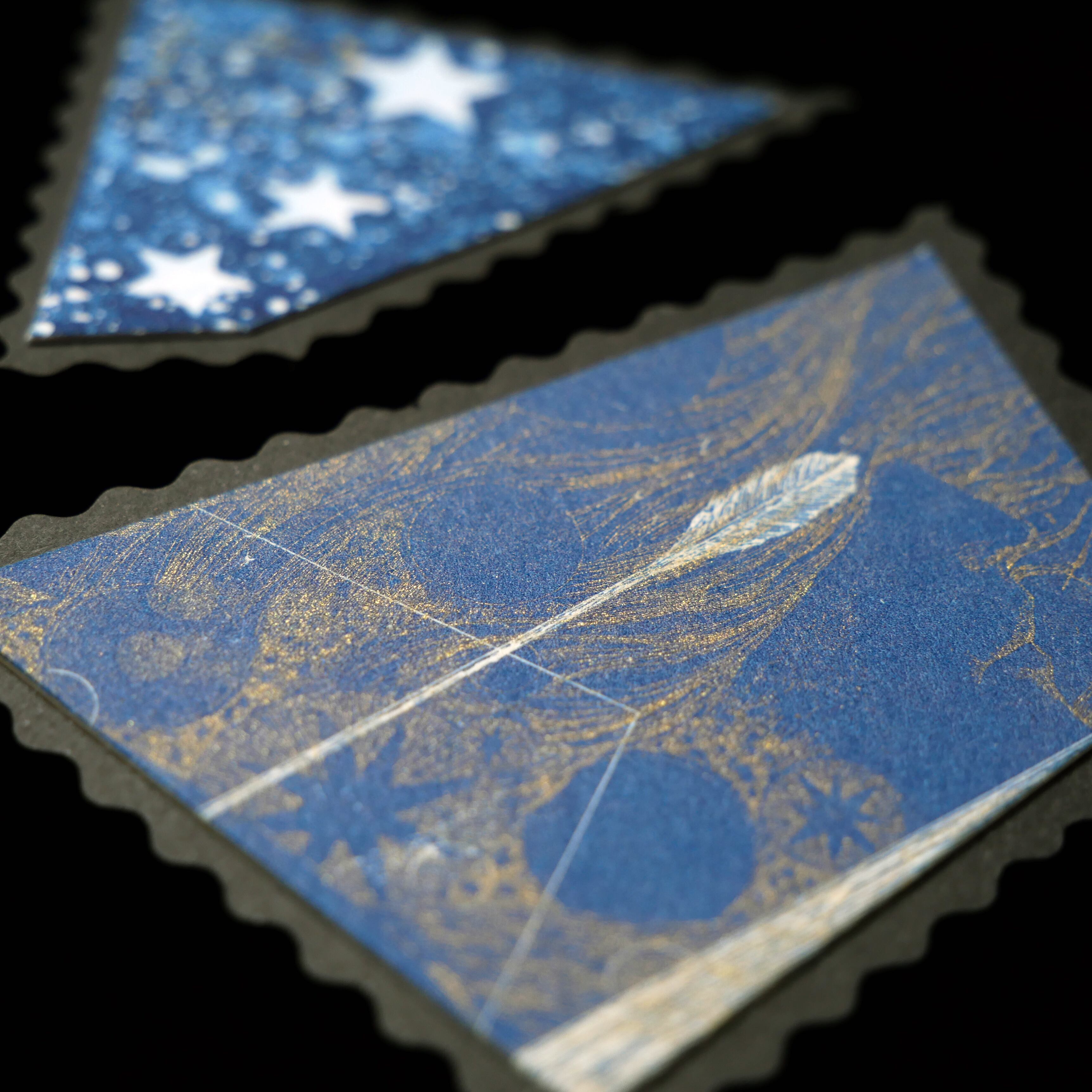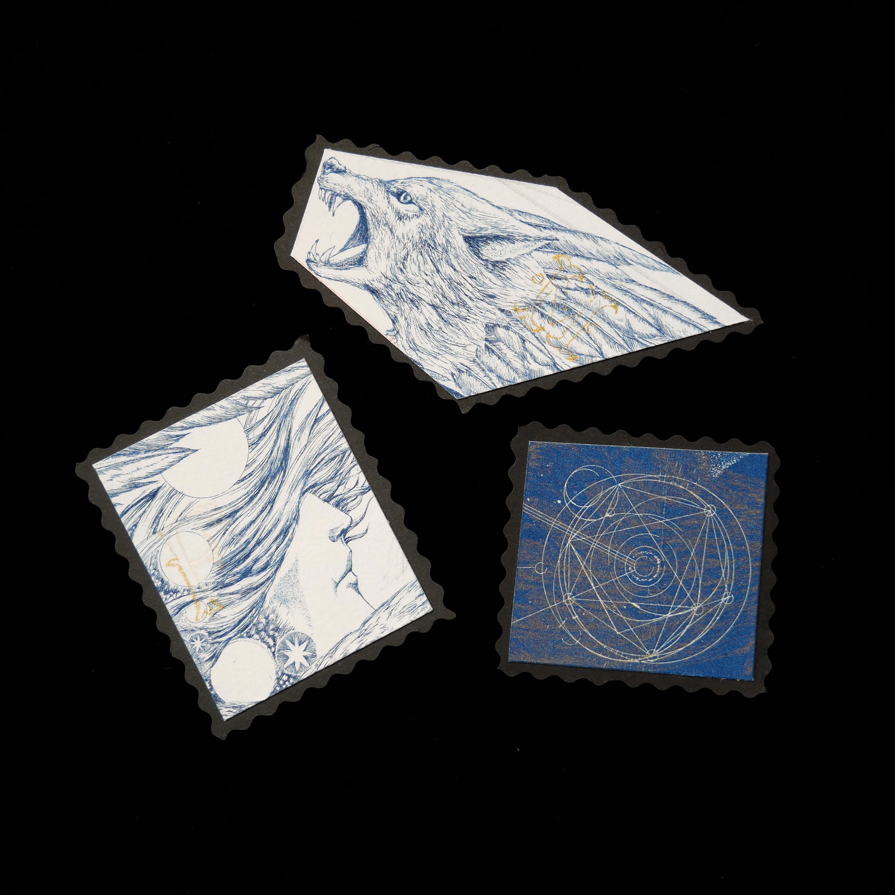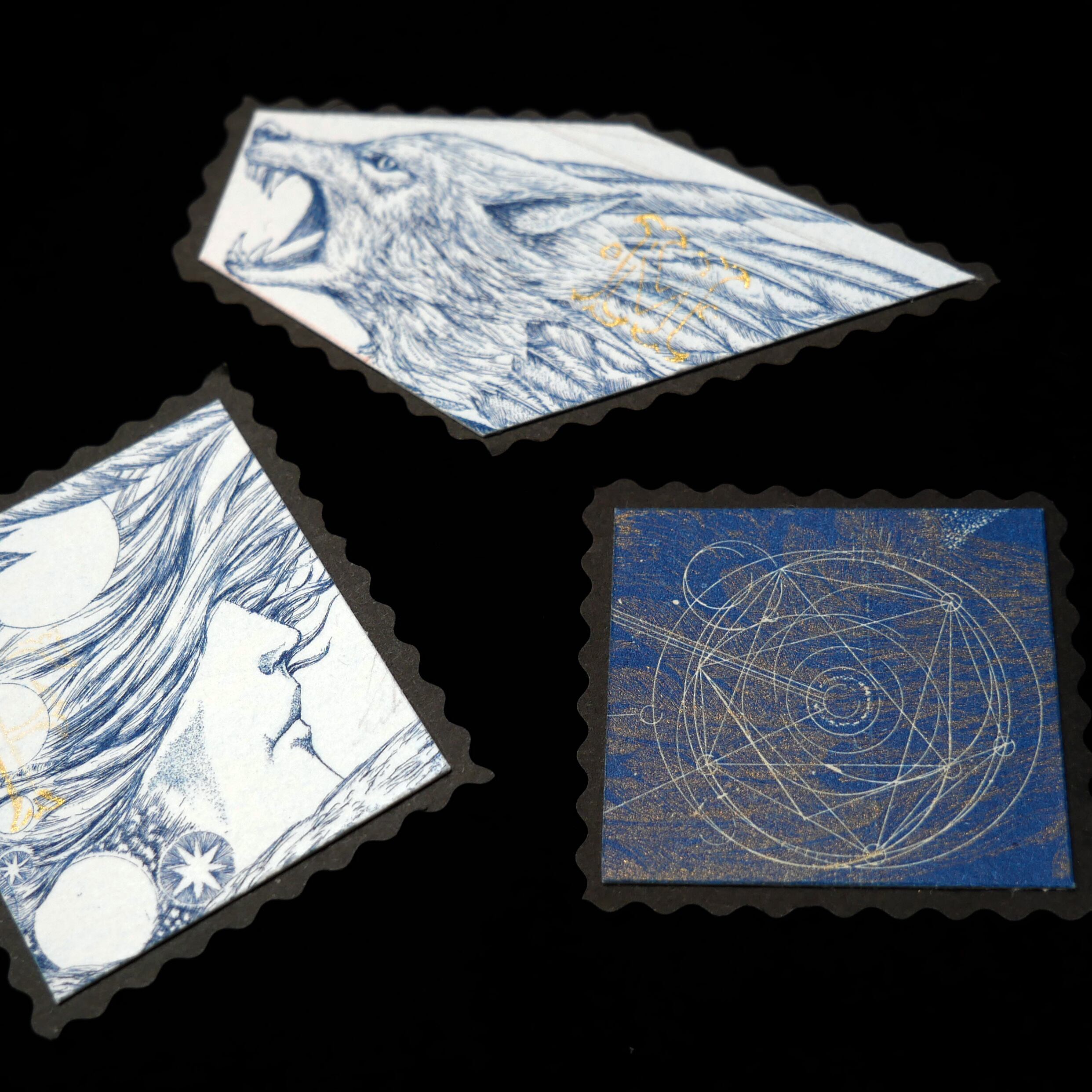 銅版画で制作した作品の部分をカットし、切手風に仕上げました。