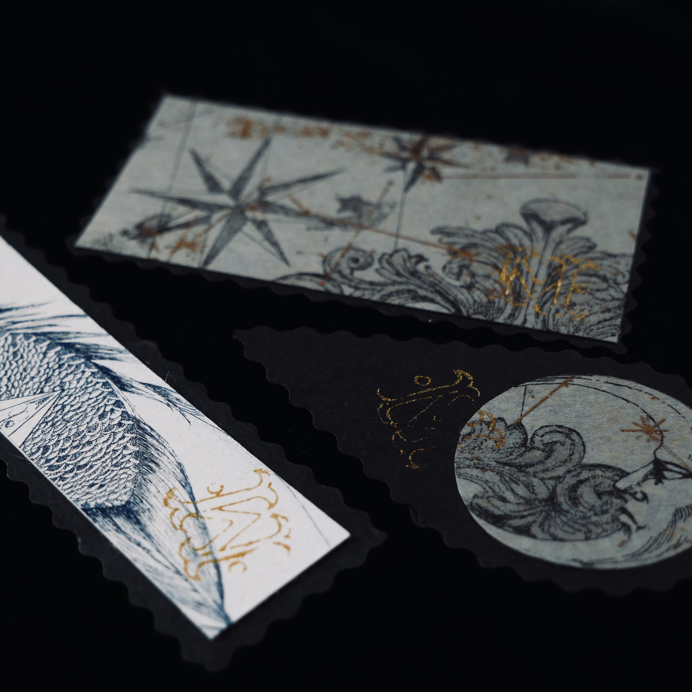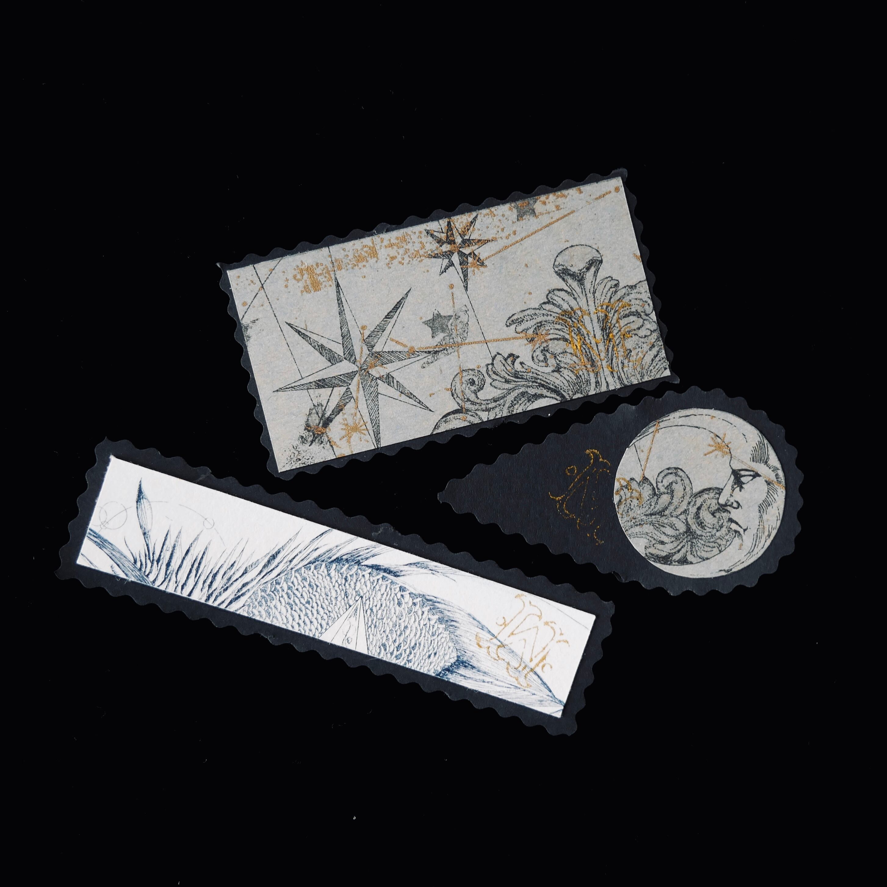 銅版画で制作した作品の部分をカットし、切手風に仕上げました。