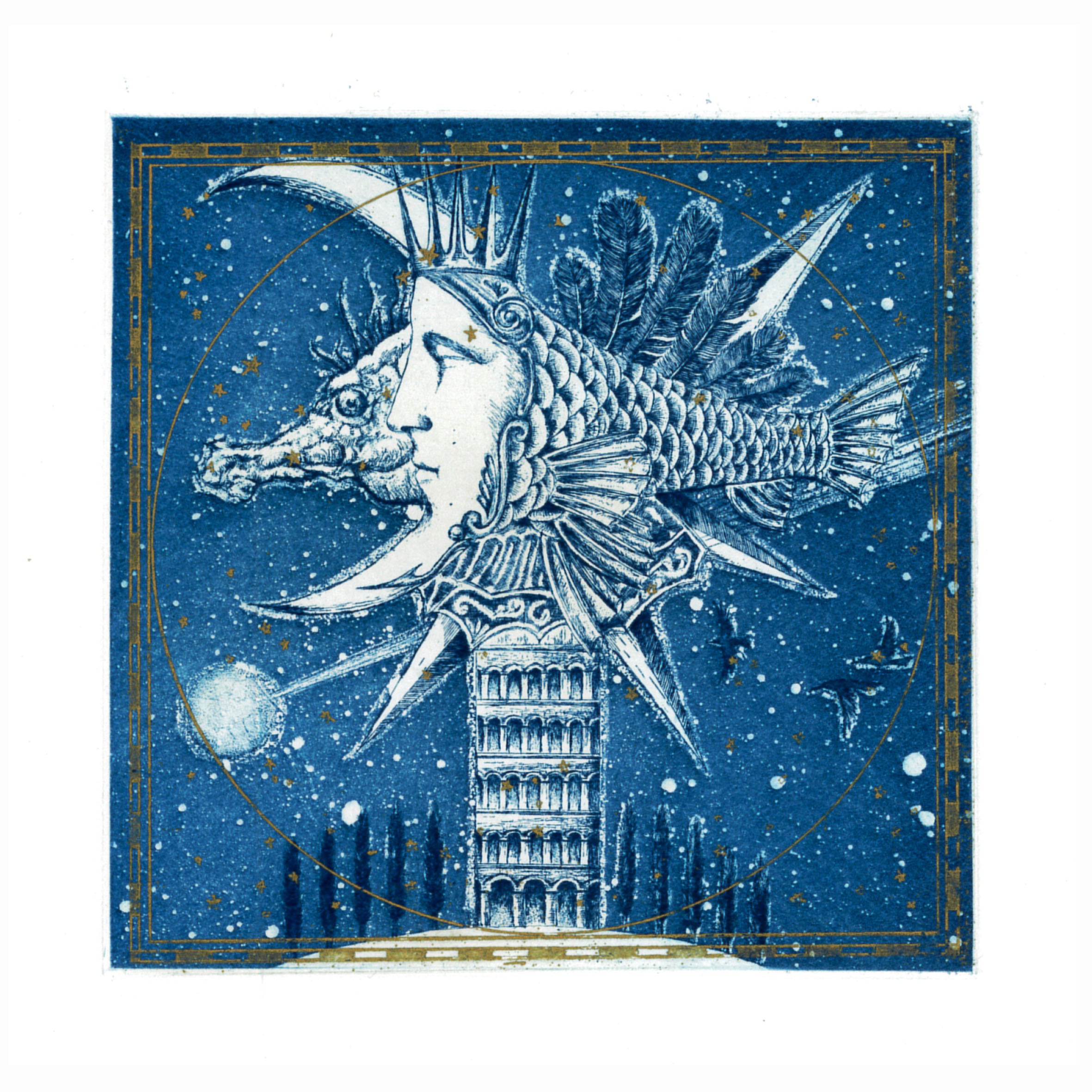 夜空を泳ぐ巨大な魚と月と、タツノオトシゴを組み合わせてみました。