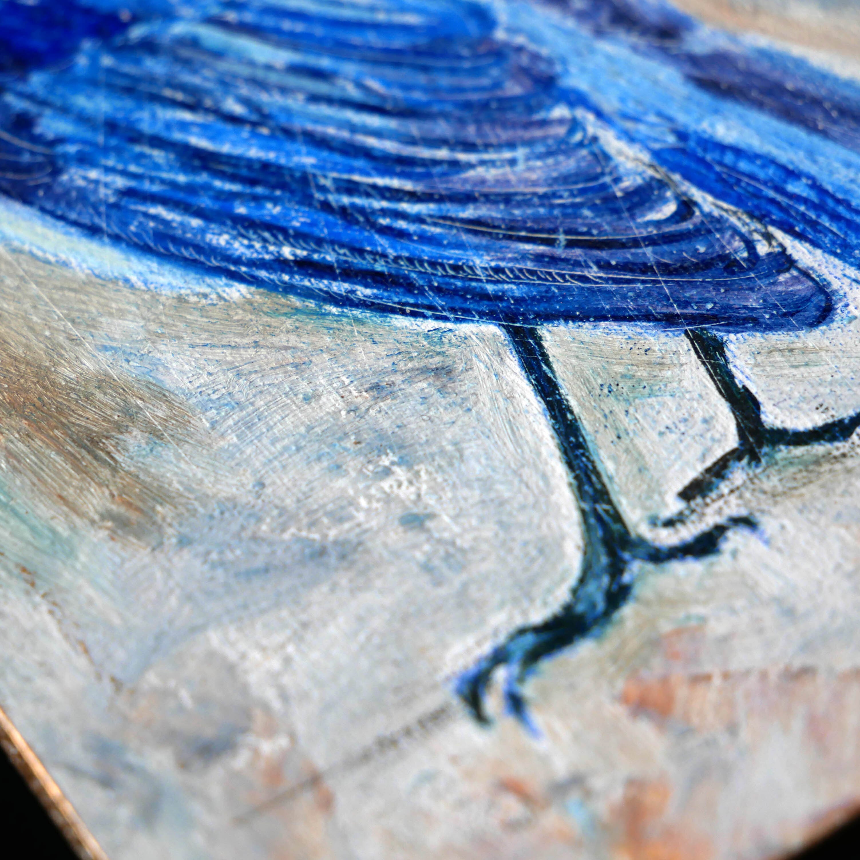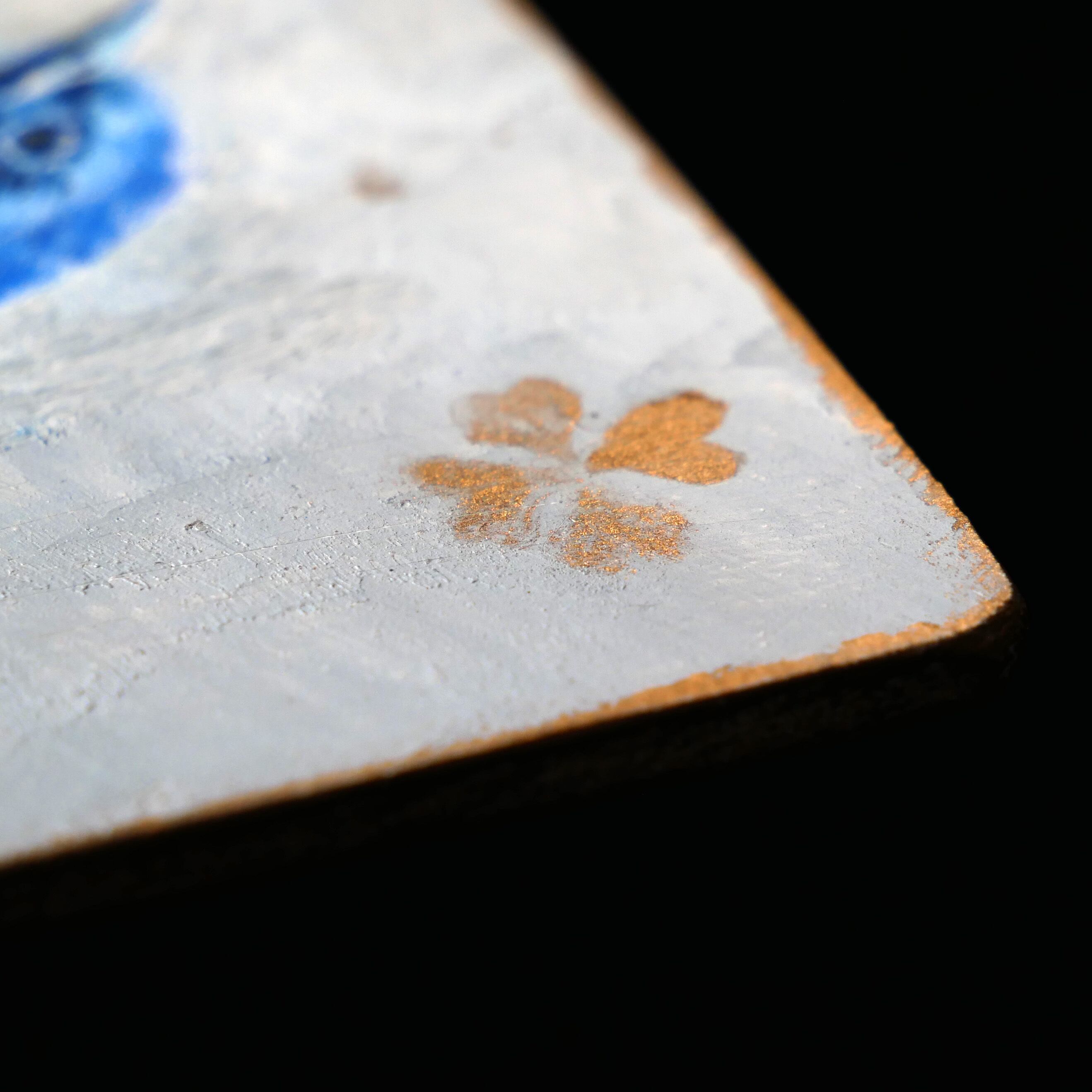 木の板にジェッソを塗り、油絵具で描画しております。所々金色の部分は額縁の補修用絵具を使用しております。